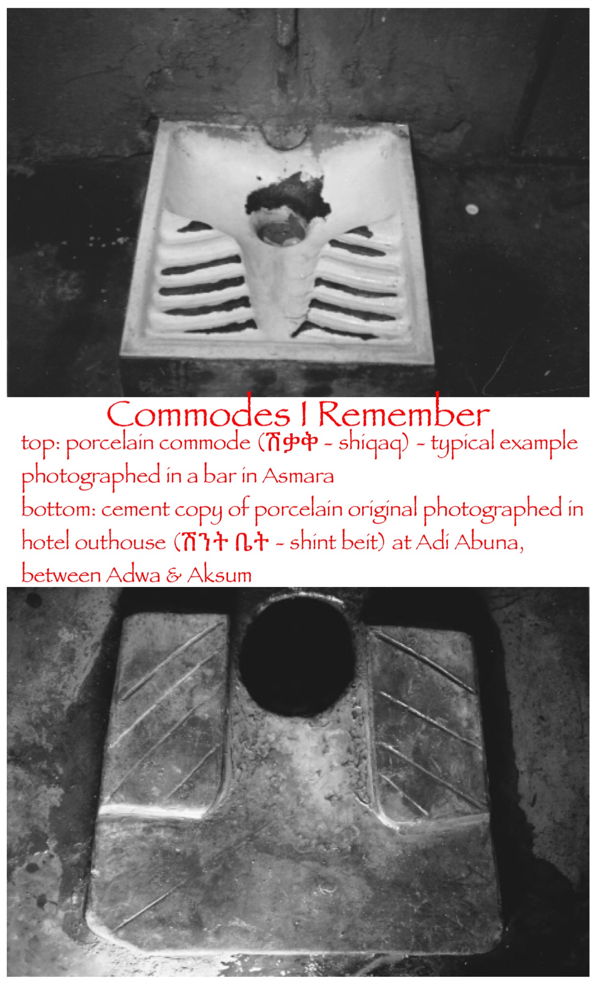 Not so much remarkable as memorable, these photos portray two examples of the typical toilets found in Eritrea & Ethiopia in the late ‘60s & early’70s when I was living in Asmara. The example in the top photo is made of porcelain, featuring two “pedestals” to stand on while squatting. The lower photo shows a hole in a cement floor with an adjacent raised area and a pair of pedestals marked with functionless diagonal slashes that mimic the rippled surfaces of the porcelain originals, which presumably were designed to ensure dry surfaces for one’s feet. This mimicry is well known to archaeologists, in which materials created by a less advanced society to copy examples from a more advanced technology slavishly mimic functionless features as well as essential ones.